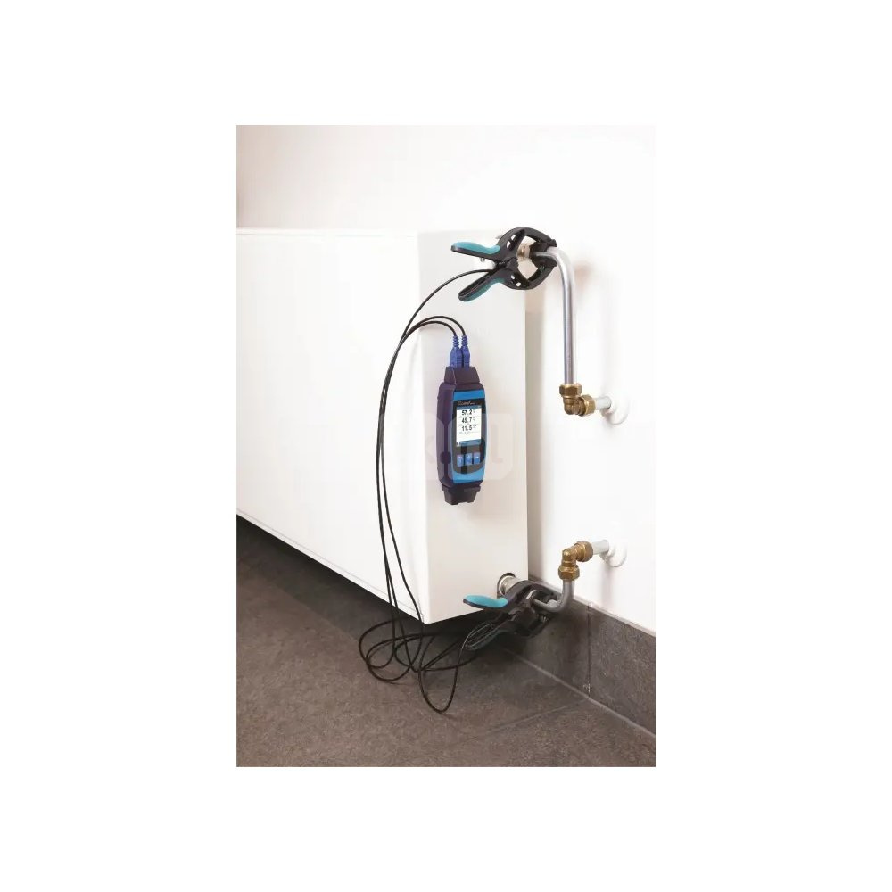- Zestaw umożliwia określanie temperatury na zasilaniu i powrocie pompy ciepła za pomocą dwóch szczypcowych czujników temperatury.