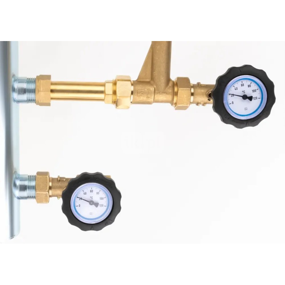 - Zawory odcinające ze zintegrowanymi termometrami do kontroli temperatury medium na każdym przyłączu.